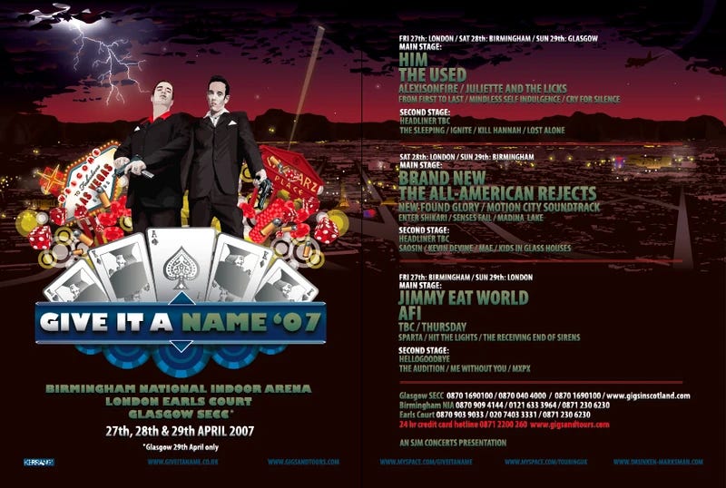 It began being torn down in December 2014 to be turned into flats. Demolishing an icon of British music and replacing it with... not much. But 7 years earlier on Saturday, April 28, 2007, I went to my second proper concert at Earls Court: Give it a Name festival. My first proper gig was My Chemical Romance at Wembley Arena in March of 2007 and Give it a Name was the perfect follow on. The festival was billed as a multi-day Emo/Pop Punk and Alternative Rock event- in the vein of the American Warped Tour. Lots of bands big, small and unknown from lots of related genres, a huge crowd of dizzy youth together in one place to get something started. After a successful initial run in 2006 in Manchester, for 2007, it was held across multiple cities in the UK- and now Europe. Truly an unmissable event for every teen Emo and surely the biggest thing happening that Spring in the capital.