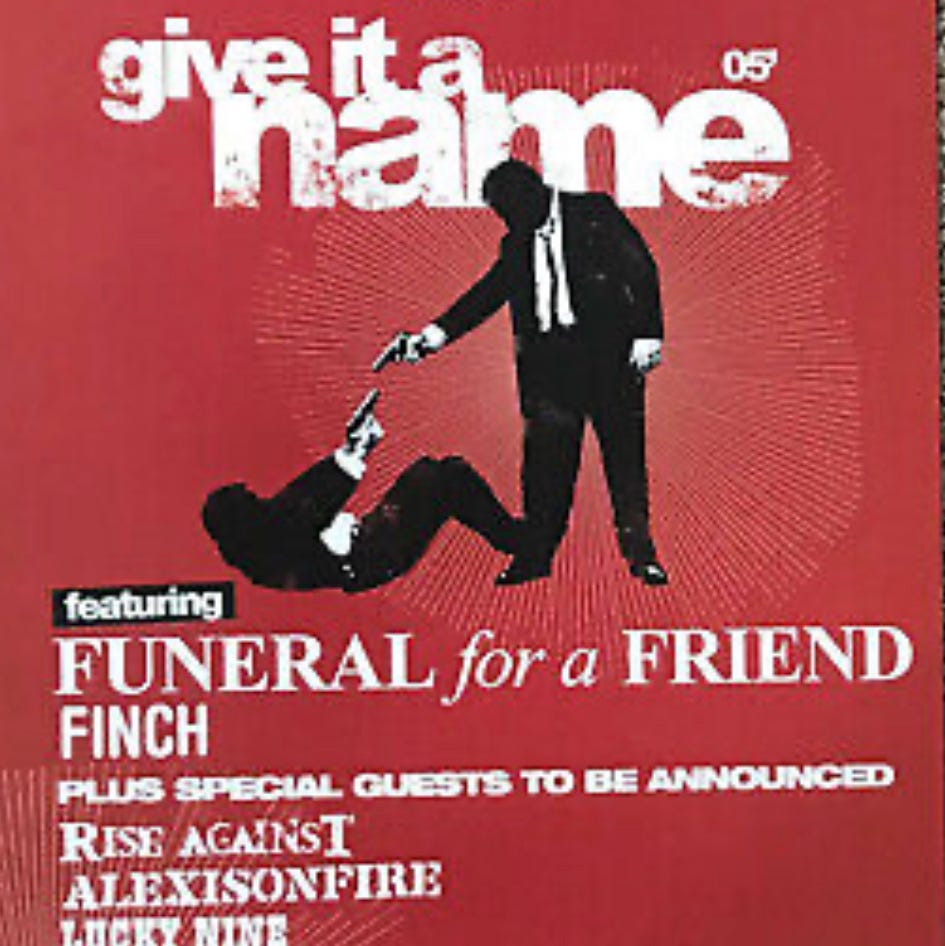 Give it a Name was also the first time I ever properly drank alcohol. Sipping and testing neat vodka on some steps near a roundabout before we went in. Supplied to us by the older concert-goers. It felt weird but alright, though I nearly lost my ticket on the way to the festival itself. These kind of aimless boozing sessions on park benches and concert steps were de rigueur for ‘00s teenage riff raff. Just a thing you were supposed to do to fit in initially, before you properly felt the taste for it and the booze got you out of your comfort zone, and hopefully into some fun MySpace photos. A clunky but maybe necessary rite of passage. I wouldn’t recommend it but I’m glad I did it.